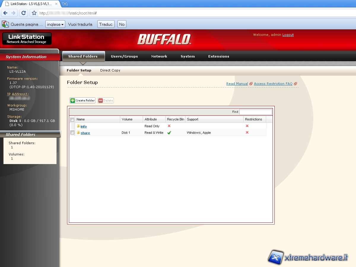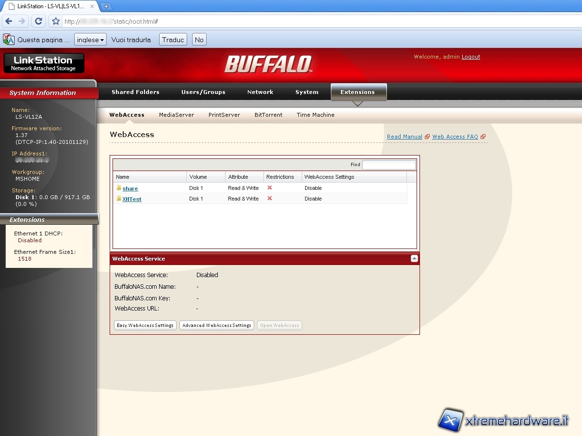 La prima sezione è “WebAccess”; La schermata ci mostra quali cartelle sono presenti sul NAS e le credenziali assegnategli.