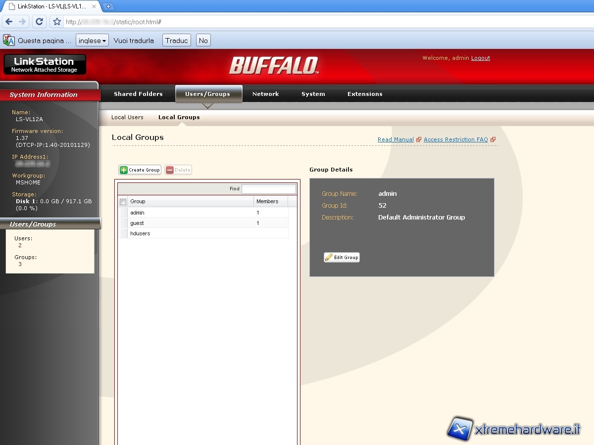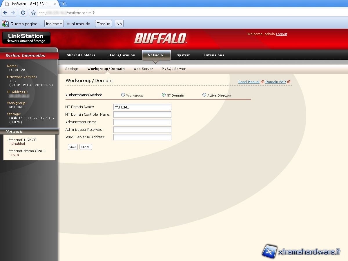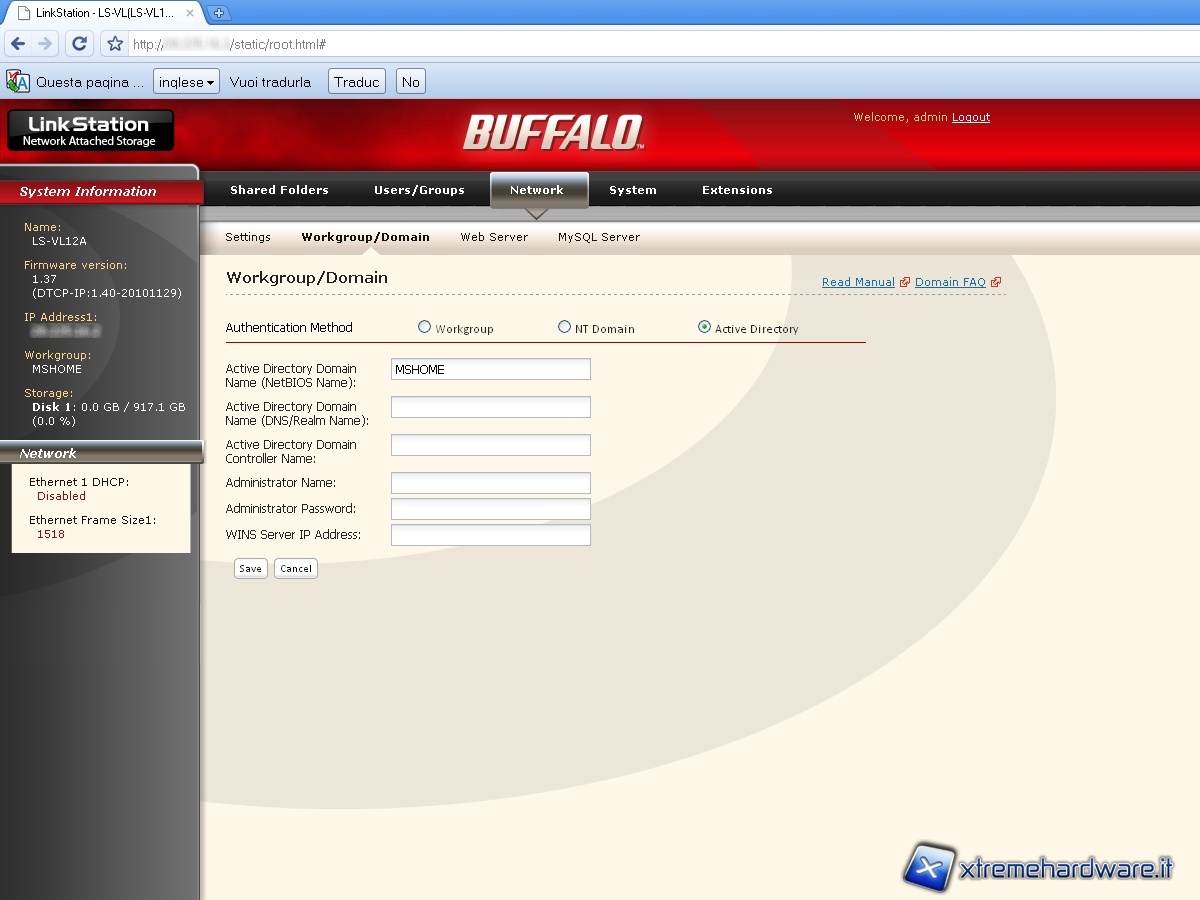 La seconda sottosezione è “Workgroup/Domain” dove sono riportate le informazioni riguardanti il gruppo di lavoro all'interno del quale è inserito il NAS.