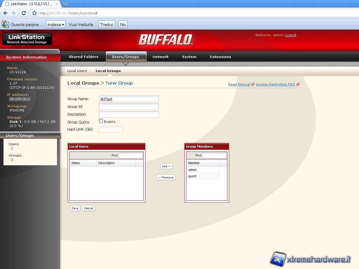 In questa schermata è possibile gestire utenti e gruppi di utenti, modificandone le credenziali e selezionando le cartelle alle quali è possibile farli accedere.