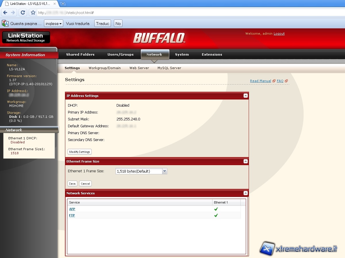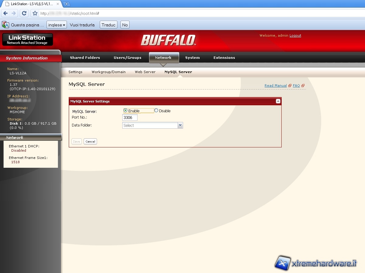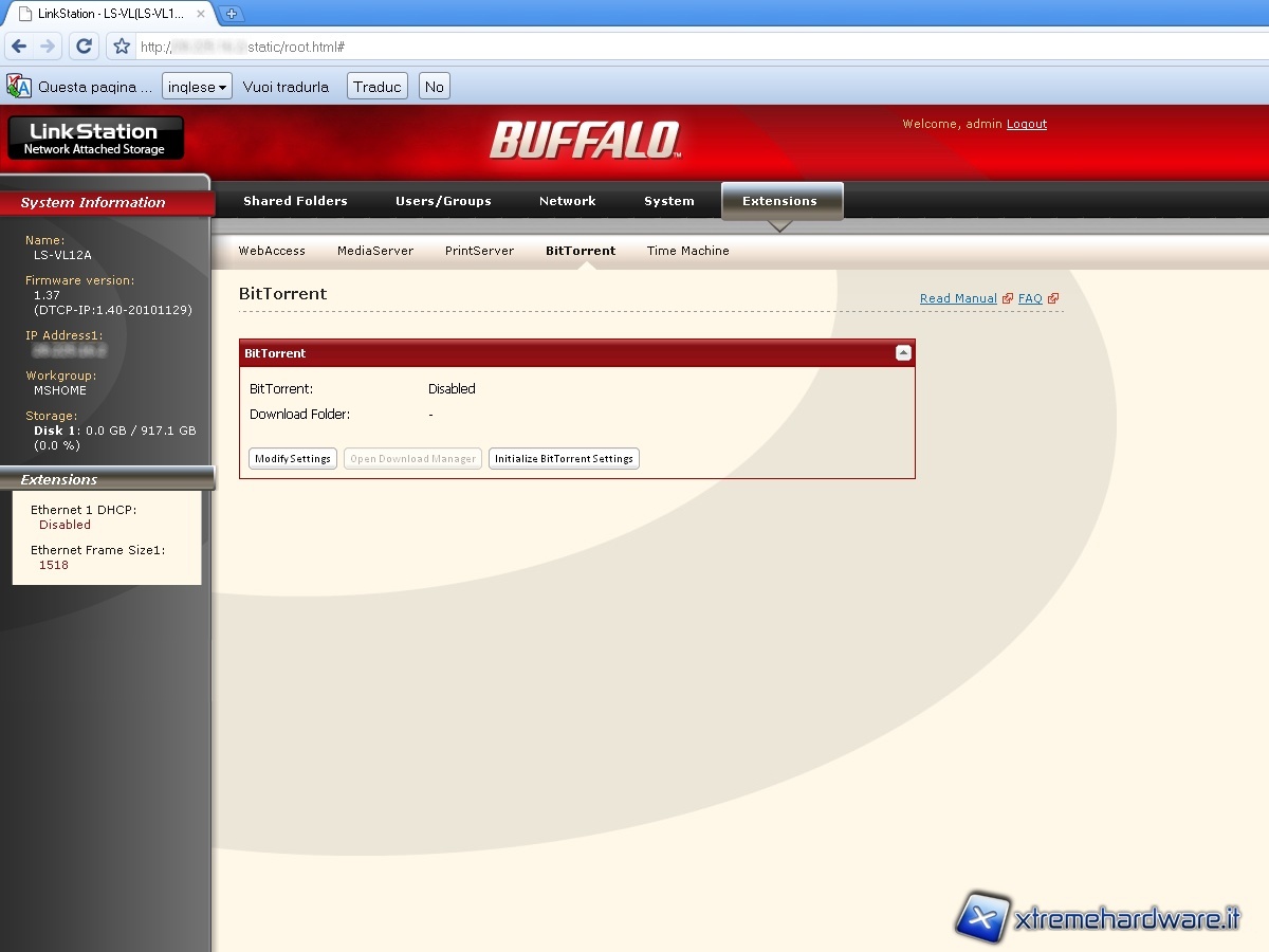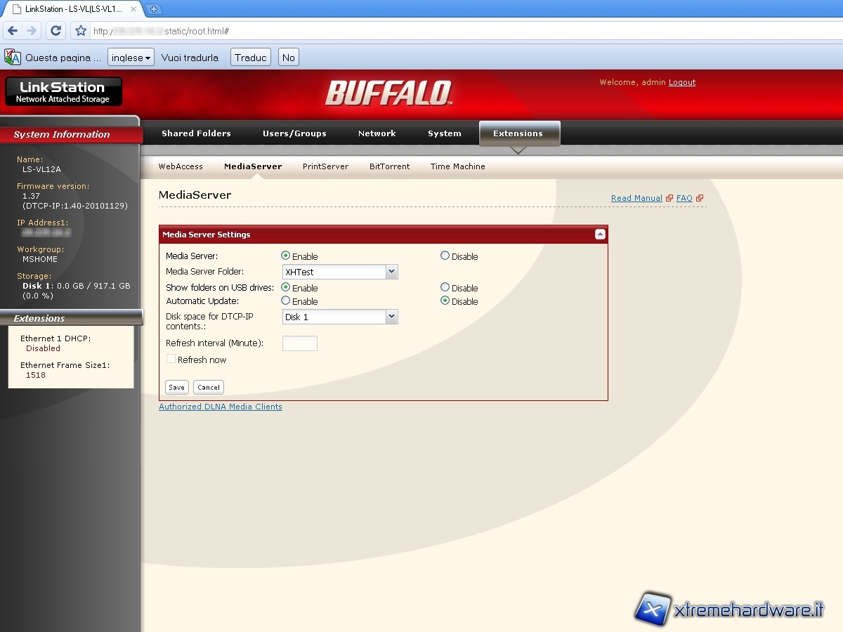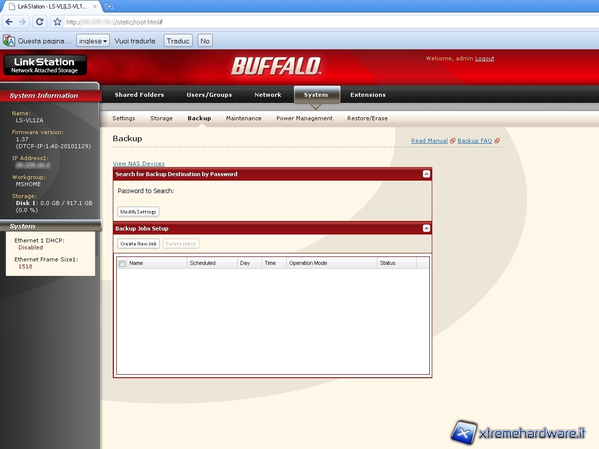 Passiamo a “Power Management”; in questa sezione possiamo impostare un timer automatico che abilita lo Sleep Mode del NAS oppure verificare il collegamento del LinkStation Pro con un UPS per garantire attività anche in assenza temporanea di corrente elettrica; una soluzione simile permette di evitare una eventuale perdita di dati in caso di mancanza di corrente durante un trasferimento dati.