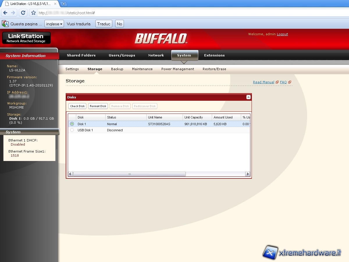 Selezionando “Restore/Erase” abbiamo la possibilità di reimpostare le impostazioni di fabbrica o formattare l'hard disk presente all'interno del Network Attacched Storage.