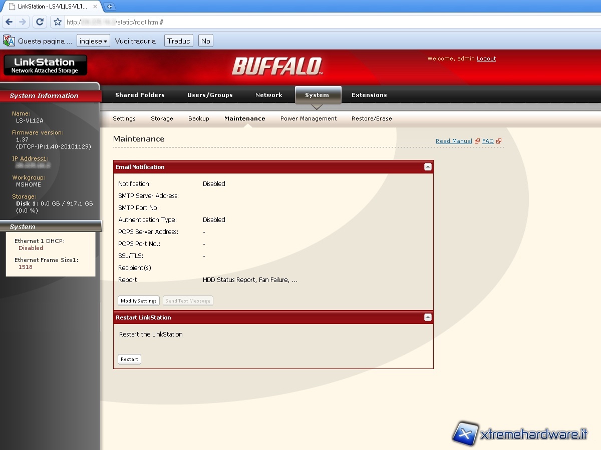 Nella schermata “Maintenance” possiamo riavviare il LinkStation Pro e impostare la notifica tramite email.